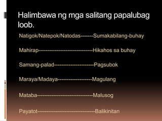 Pormal Kolokyal Nasaan Nasan Kani-kaniya Kanya kanya Tayo na Tana Piyesta Pista Saan San Aywan Ewan 9. Tiyaking nagkakaisa ang aspekto ngmga pandiwang ginamitDi angkopWalang pasok dahil sususpindihinang klaseAngkopWalang pasok dahil sinususpindi angklase. Ang ibig sabihin nito ay hindi sila likas na mga kataga sa wikang Filipino.