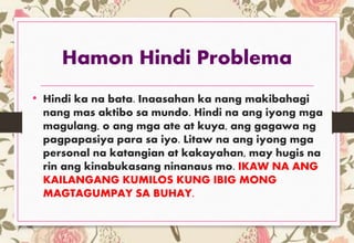 Kasama sa pagkilala sa sarili ang pag-unawa sa iyong sariling mga gawi mga pangangailangan mga hangarin mga lakas at kahinaan at lahat ng bagay na mahalaga sa iyong pagkatao. Kaya ng mga kabataan na paunlarin ang panlipunang eknomiya ng isang bansa bastat magabayan lamang sila ng tama. Ano ang ibig sabihin ng makatarungan tnx - 500795.