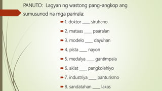 Mga halimbawa ng mga salitang magkasalungat. Gamit ng pang uri at pang abay iisang baybay magkaibang. Ang pang-angkop ay mga salita o katagang ginagamit sa pag-ugnay ng mga salitang naglalarawan at inilarawan.