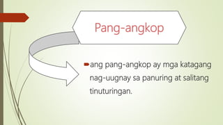Kahulugan Ito ay isa sa walong mga bahagi ng pananalita na mga katagang nagdudugtong sa magkakasunud-sunod na salita sa isang pangungusap para magiging magaan o madulas ang pagbigkas nito. Pang-angkop ng ng - Ito ay isinusulat karugtong ng mga salitang nagtatapos sa mga patinig a e i o u. Ang banal na kaulatan.