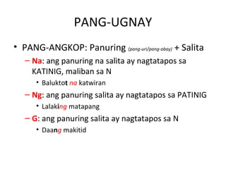 Ang pang-angkop ay mga katagang nag- uugnay sa panuring at salitang tinuturinganHalimbawa Ang magandang talon sa Pagsanjan ay hinahangaan ng lahat. Maaari itong gamitan ng mga salitang kung kaya kung gayon o kaya. Daw raw di umano Halimbawa.