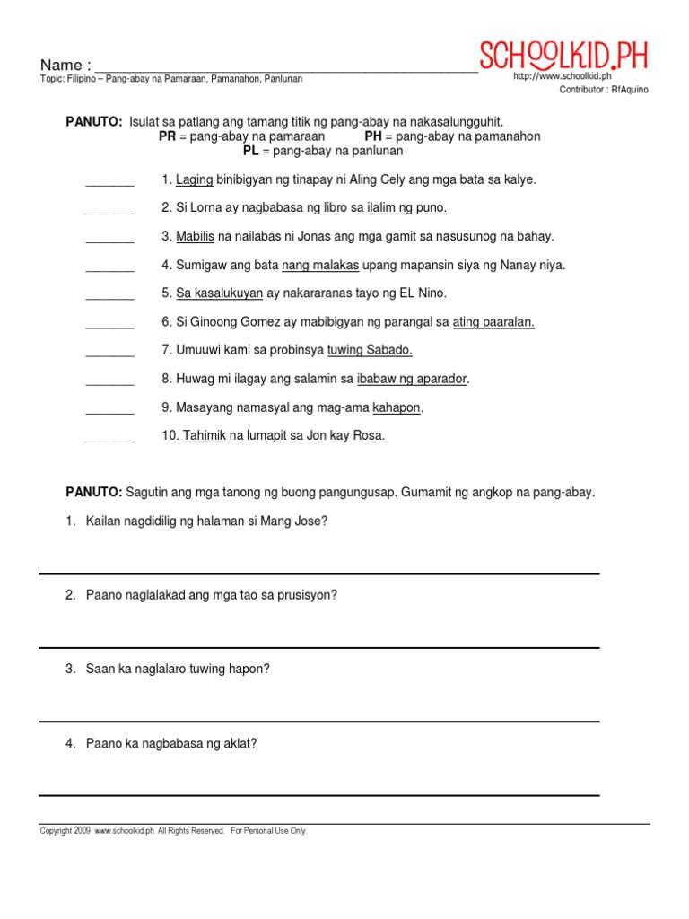 Hindi maganda magtungo sa Bicol kung tag-ulan. Click on Open button to open and print to worksheet. Some of the worksheets for this concept are Pang abay na pamaraan1 Pagtukoy sa pang abay na panlunan 1 Pagsasanay sa filipino Pagsasanay sa filipino Talata Pinag ayaw ayaw na gawain sa filipino baitang walo taong Packet 6 subject verb agreement La misma luna movie study guide answers.