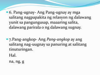 Pangatnig conjunction mga salitang nag-uugnay ng dalawang salita parirala o sugnay b. May tatlong pang-angkop ang ginagamit sa pag-uugnay ng mga salita. May tatlong pang-angkop ang ginagamit sa pag-uugnay ng mga salita1.